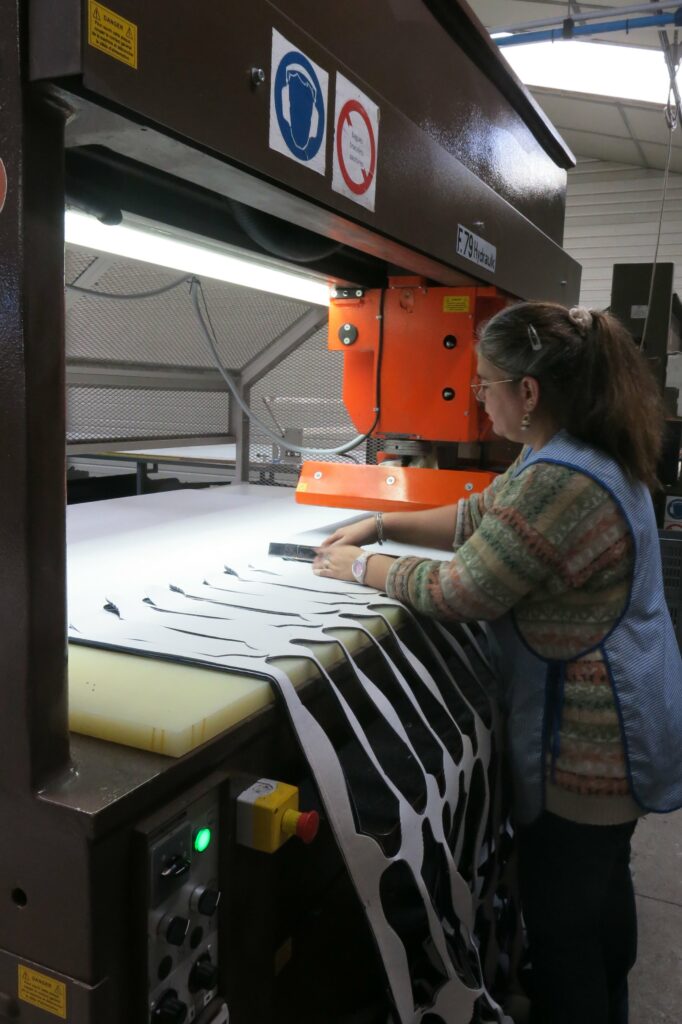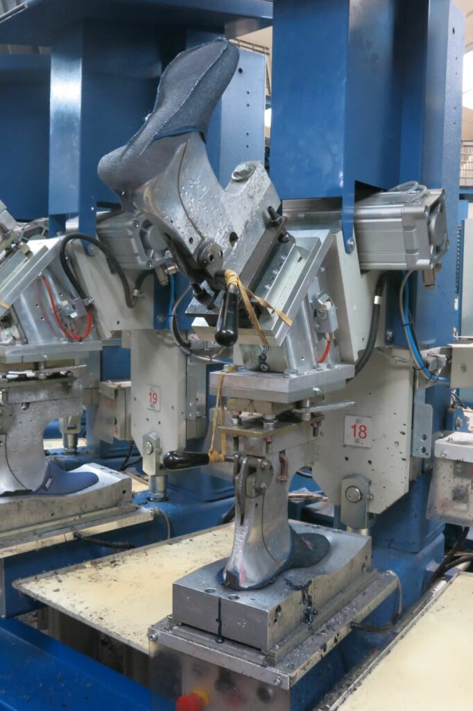 Lors de la visite des ateliers, toutes les étapes de la fabrication sont visibles : de la coupe des premières (semelle intérieure sur laquelle repose directement le pied) jusqu’à l’injection du fameux PU (polyuréthane) de la semelle Airflex™, en passant par l’étape du bordage avec la pose d’un galon de confort à l’ouverture de la tige. L’assemblage par couture de la tige et de la douillette (ou première) se fait à main levée sur des machines à coudre droites ou rondes appelées Strobel qui demandent une grande maitrise et une longue formation. Autant de procédés parfaitement maîtrisés depuis des lustres par des ouvriers et ouvrières qui transmettent ces savoir-faire et permettent à Airplum d’avoir le précieux label EPV ainsi que la certification OFG.