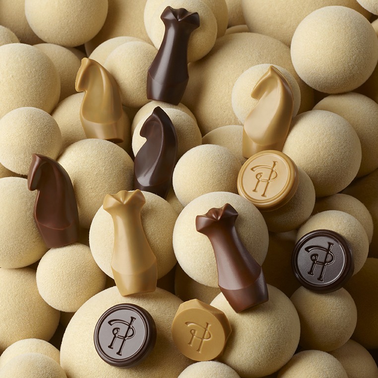 Fruit d’une collaboration entre la Maison et le MOF Arnaud Larher, cet œuf en chocolat au lait au décor délicat est entièrement confectionné à la main. À l’intérieur, il renferme un trio de fritures pralinées feuilletées en forme de fleurs, associant chocolat noir, chocolat au lait et chocolat caramel.