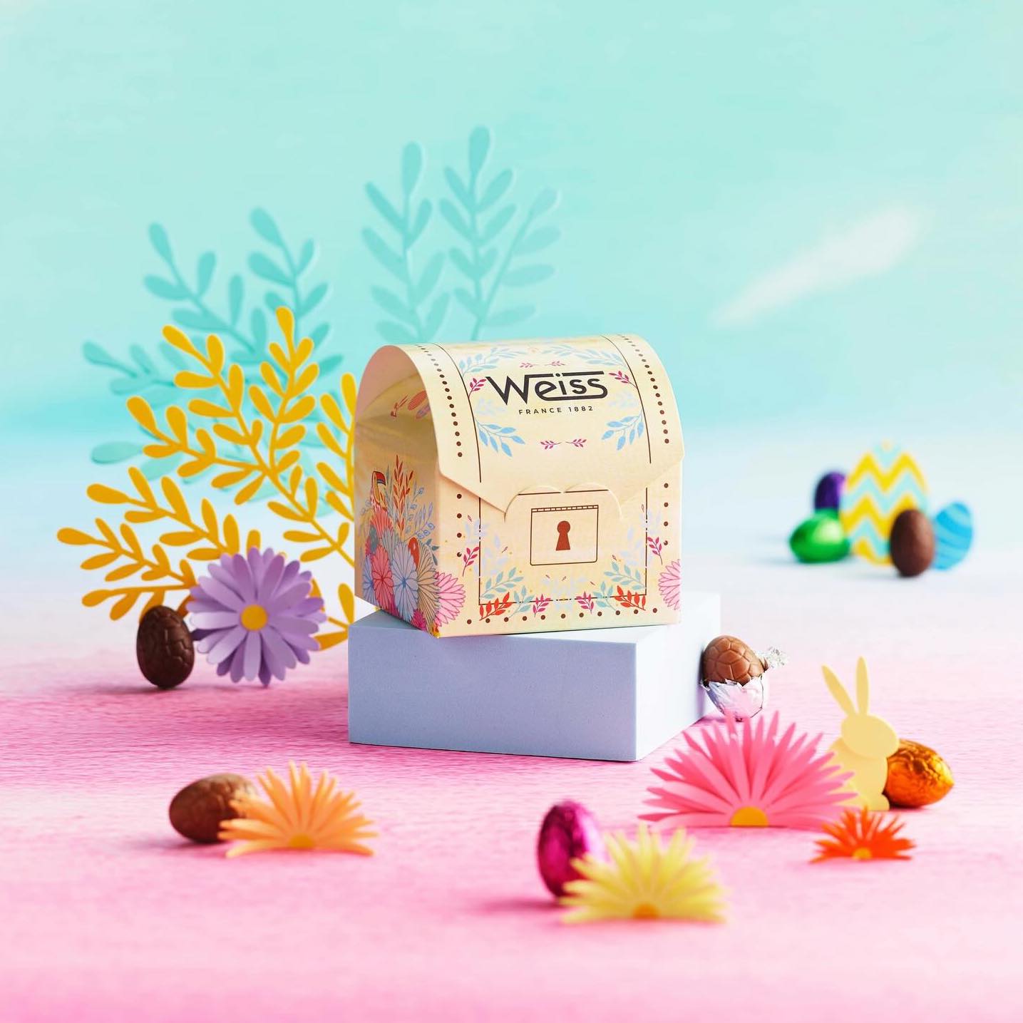 Cette Malle au trésor renferme un assortiment de 5 recettes d’œufs de Pâques en chocolat noir et lait : praliné croquant lait, praliné noir croquant, biscuité noir, ganache lait et coco lait. Le coffret au design coloré est inspiré de l’Île au Trésor.