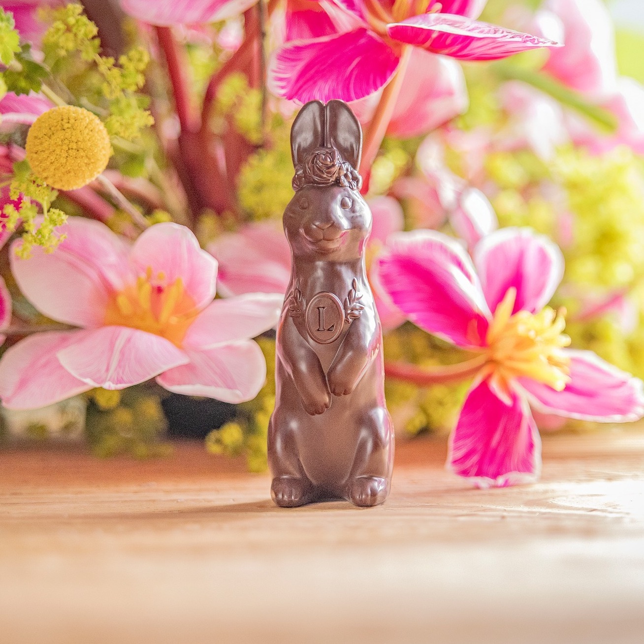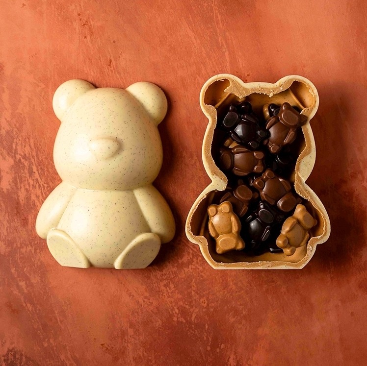 Lala le Lapin, icône espiègle de Pâques de la Maison, revient cette année avec des inclusions de fruits secs caramélisés : noisettes caramélisées pour le chocolat noir et cacahuètes caramélisées pour le chocolat au lait. Existe aussi en chocolat blanc délicatement rosé.