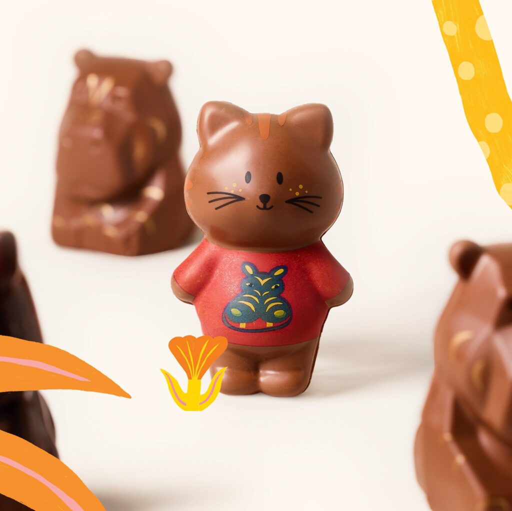 Les Chatons Chapon font leur retour. À l’effigie de Sam l’Hippopotame, ce petit chat est réalisé en chocolat lait aux cacaos rares d’Équateur. Il est garni d’un mélange fritures au cacao rare Madagascar, de fritures pralinées lait pistache, noir pistache, lait yuzu et blanc praliné.