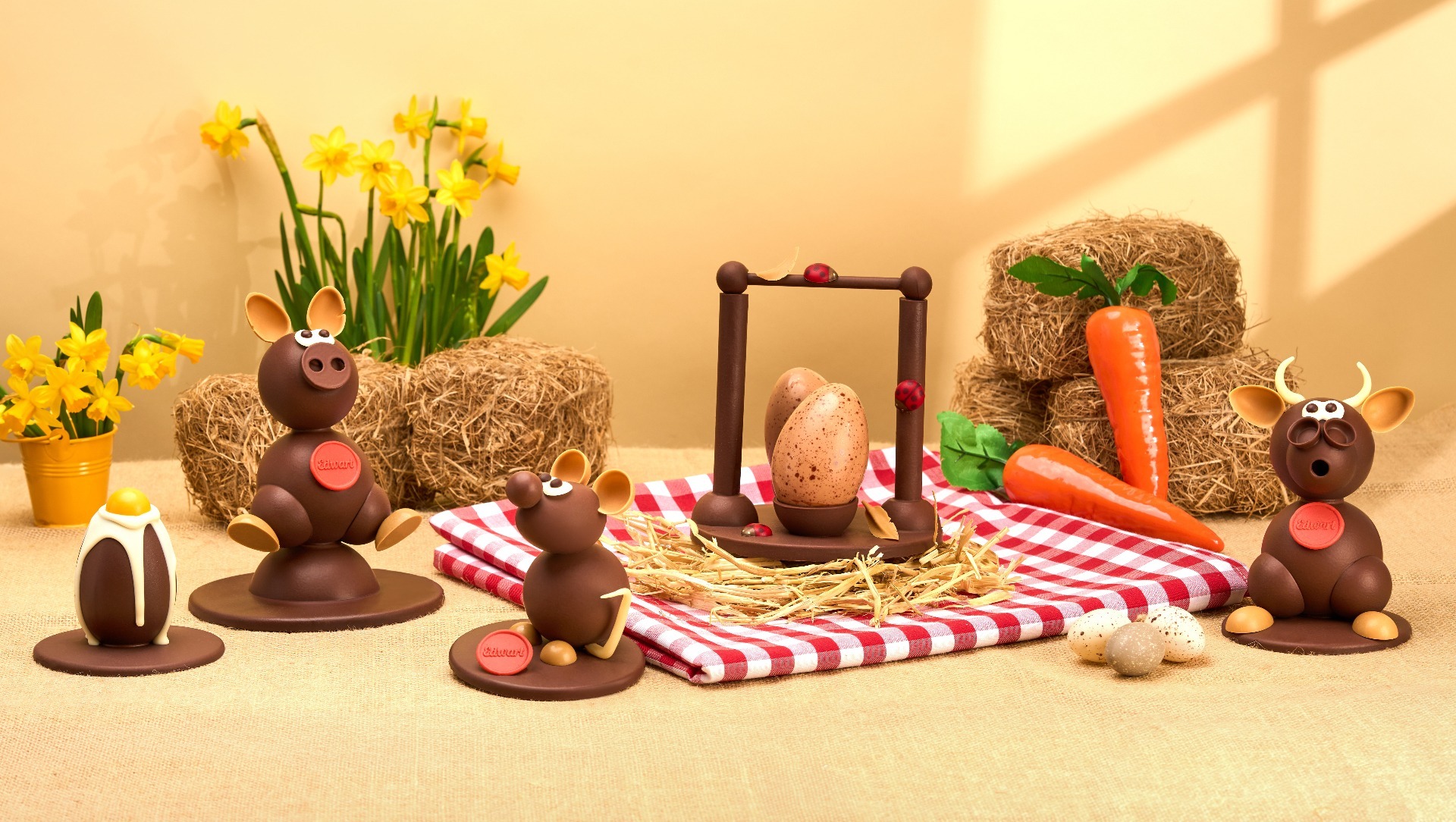 Avec cette collection de Pâques, le jardin devient gourmand et dévoile des moulages garnis totalement craquants : Jean de la Souris, Vincent Van Bœuf, Francis Bacon et bien sûr l’œuf coque plus vrai que nature.