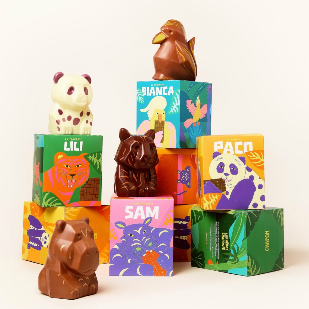 Sam, Bianca, Paco et Lili, 4 moulages en chocolats noir lait ou blanc, garnis de friture au cacao rare de Madagascar. Chaque moulage Héros de la Chaponie est accompagné d’une carte personnage et d’une planche de tatouages éphémères.