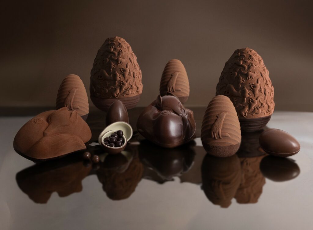 Comme chaque année, tous les artisans chocolatiers – y compris les industriels – ont travaillé pour nous régaler visuellement et gustativement. Si les traditionnels moulages d’œufs, de poules et autres lapins continuent d’être proposés, on voit néanmoins apparaitre tant en GMS que dans les boutiques spécialisées tout un bestiaire chocolaté. Et face à l’augmentation du prix du chocolat, notre conseil, privilégiez la qualité à la quantité !